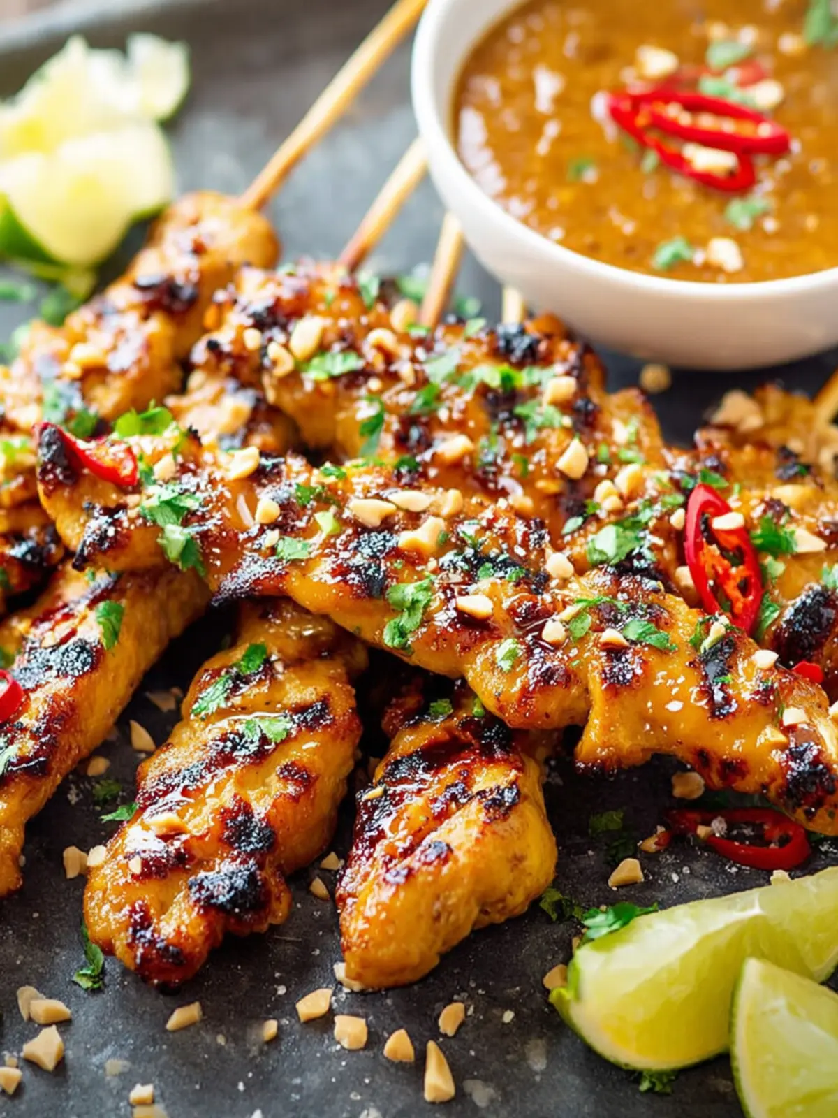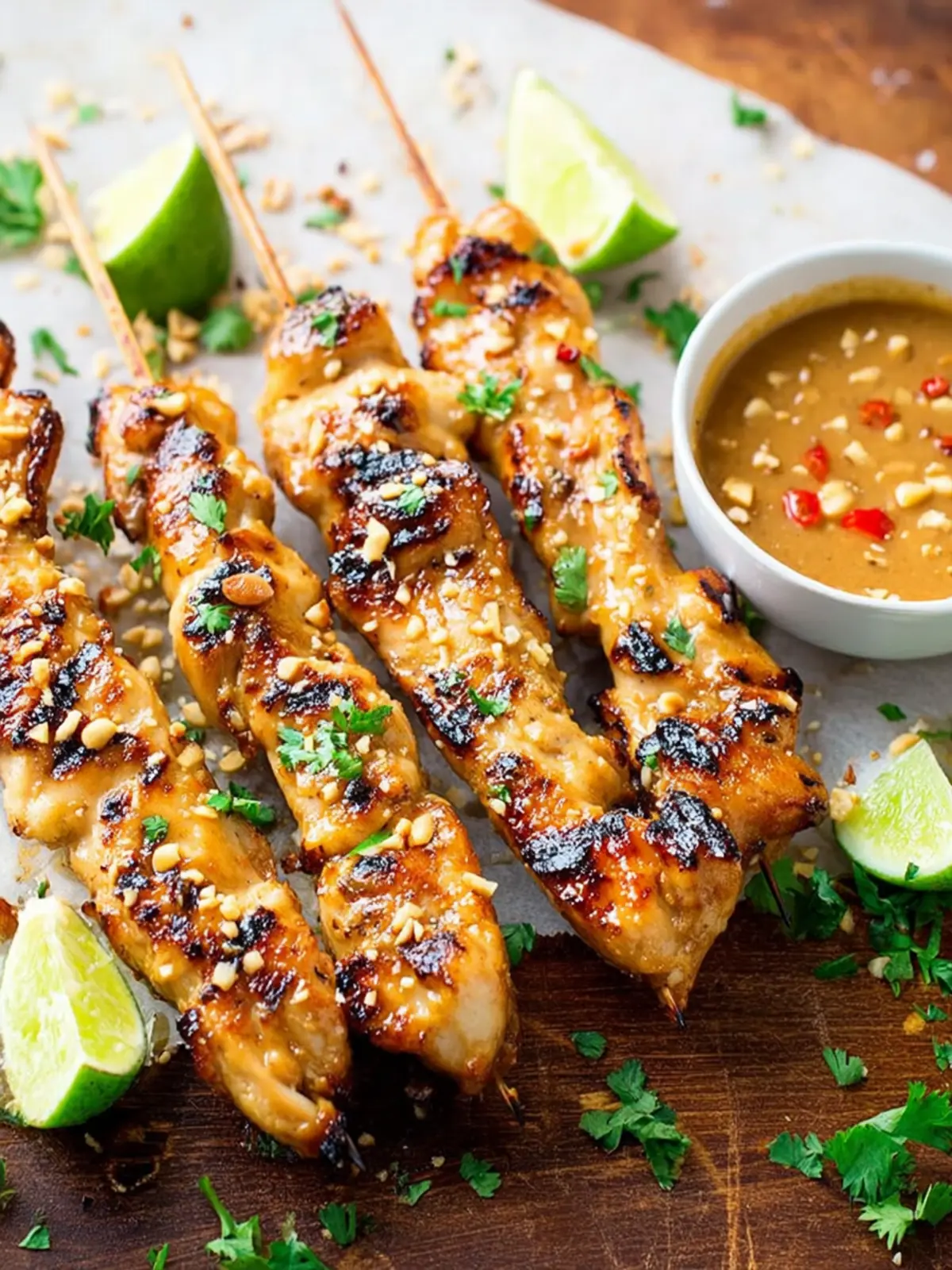 Delicious grilled chicken satay served with a creamy peanut sauce, perfect for summer barbecues.