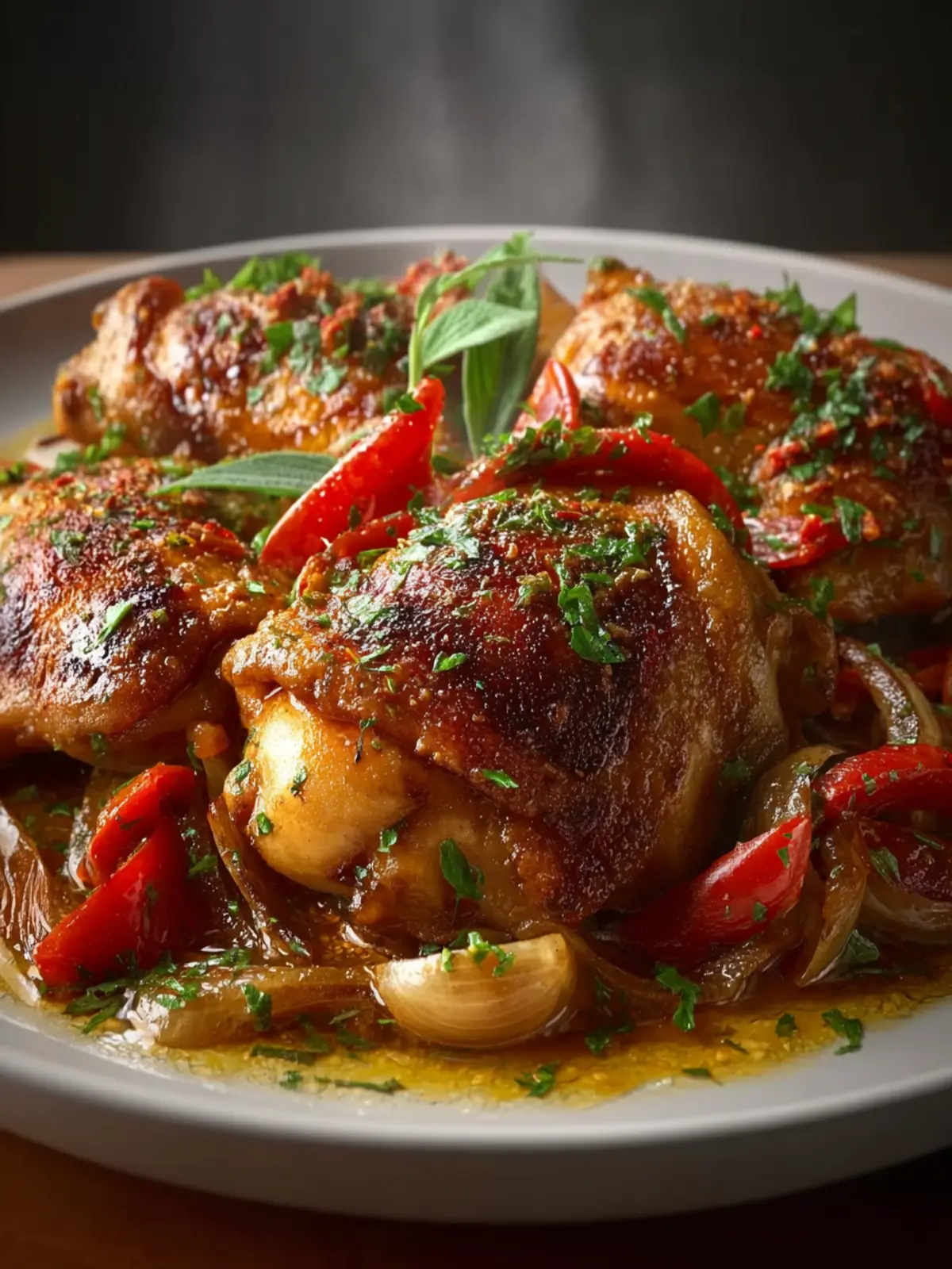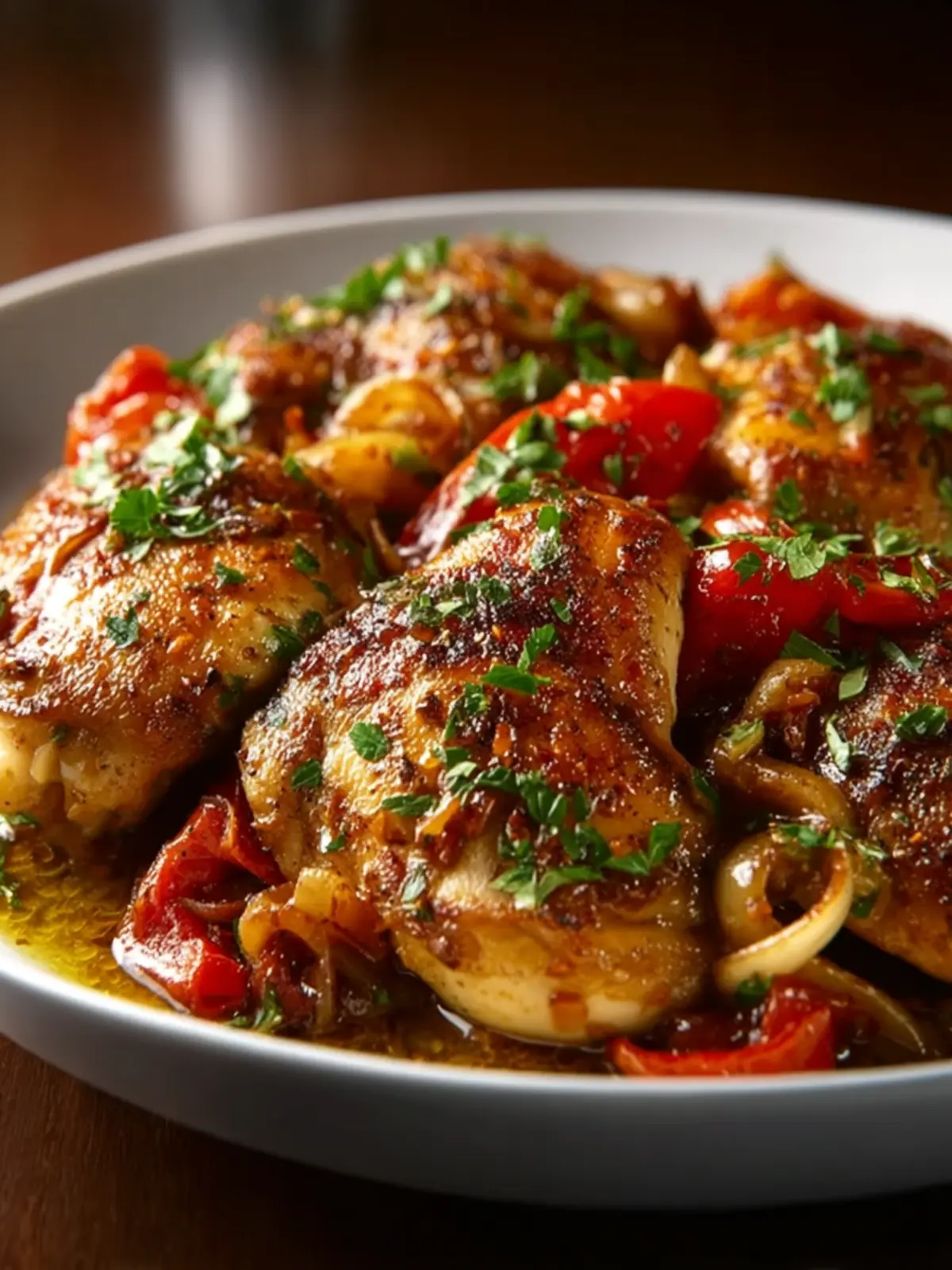 A savory dish featuring crispy chicken thighs, sausage, and a medley of colorful peppers tossed in a rich, flavorful sauce.