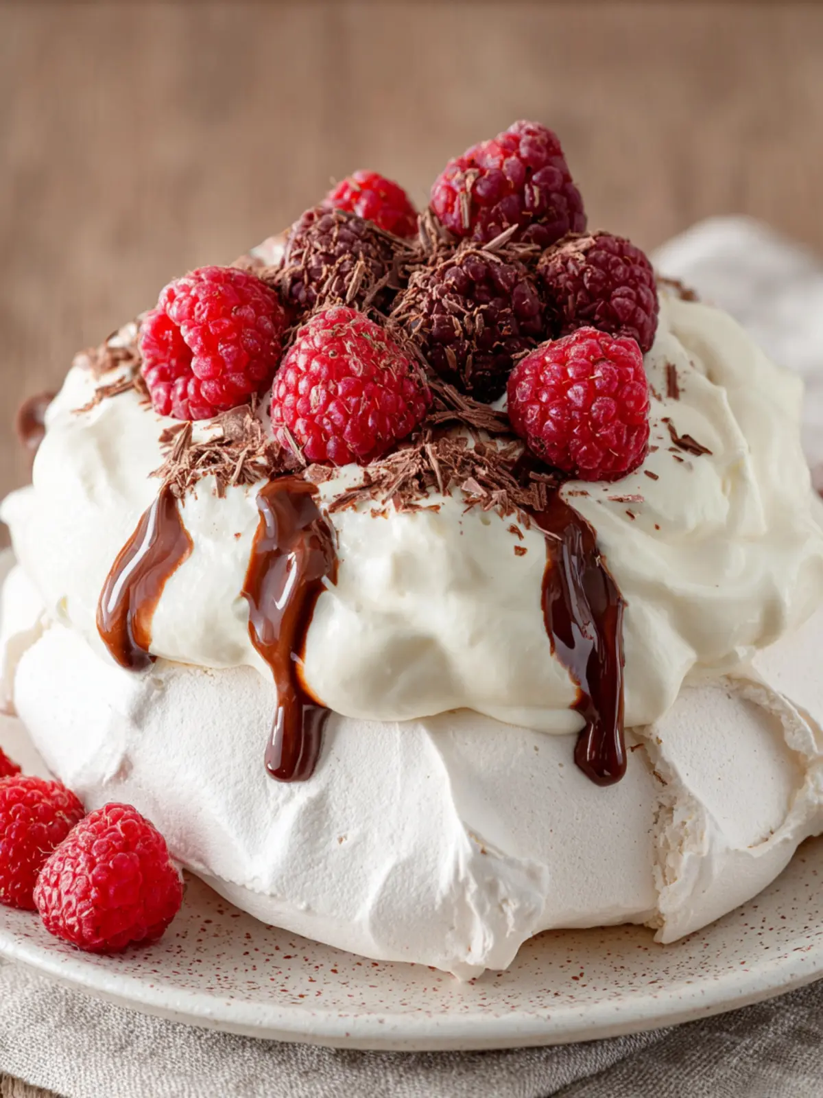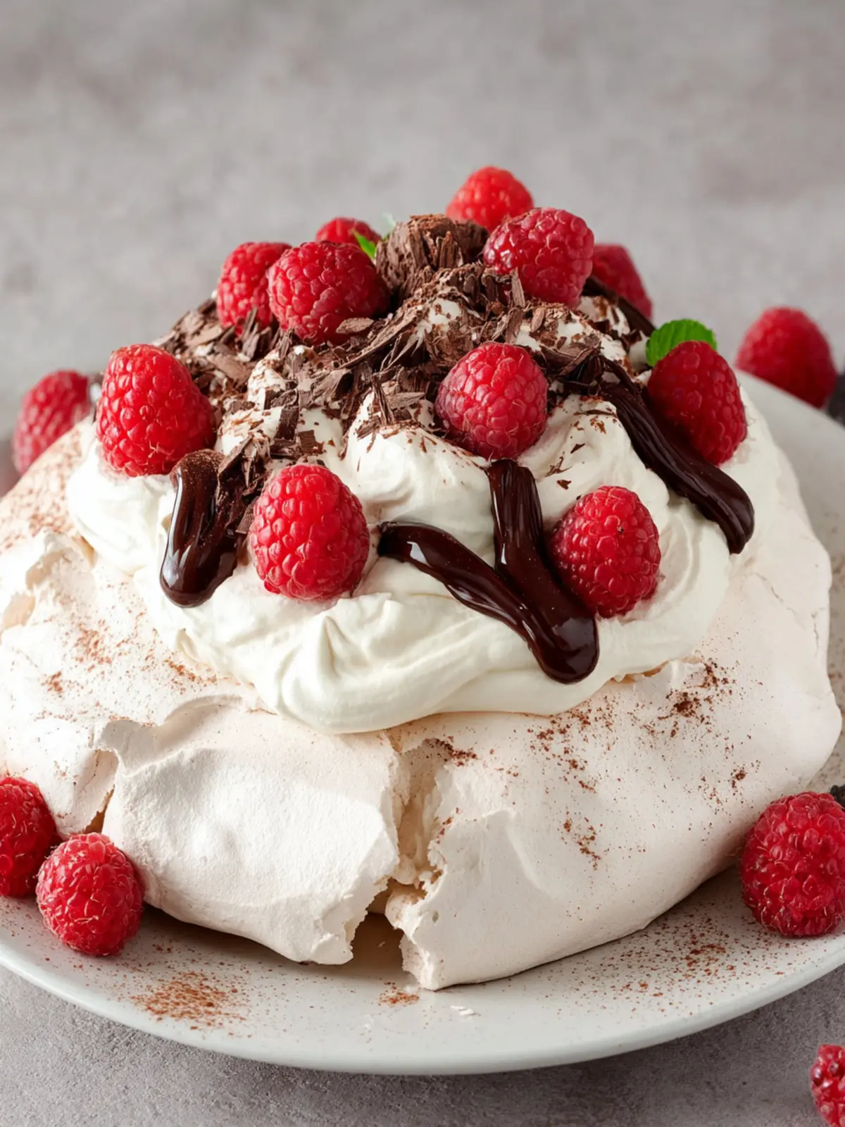 A light and airy chocolate pavlova topped with fresh raspberries and whipped cream.