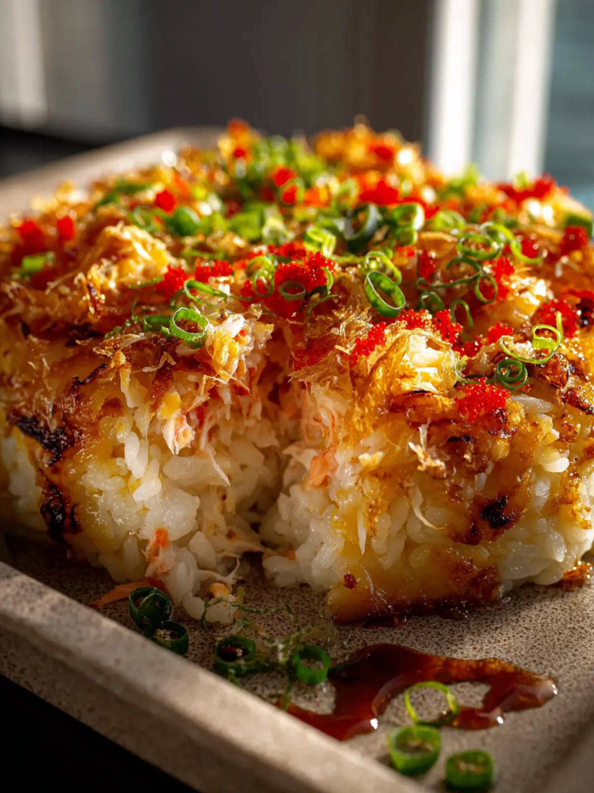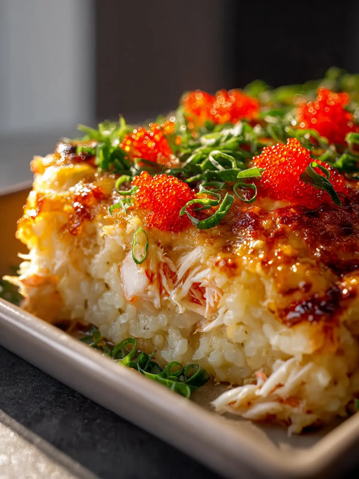 Flavor Fusion: The dish combines traditional sushi flavors with the warm, comforting elements of a casserole. Expect the umami richness of crab and the slight sweetness of components like mayonnaise and cream cheese to create a mouthwatering combination.