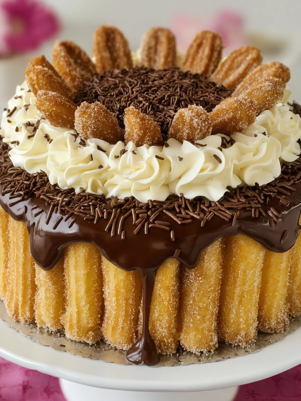 - Assemble the Cake: Place one cake layer on a serving plate. Spread a layer of ganache on top. Place the second cake layer over the ganache and spread more ganache over the top and sides. Press churros around the sides of the cake. Pipe remaining ganache and any leftover cinnamon mixture on top for decoration.