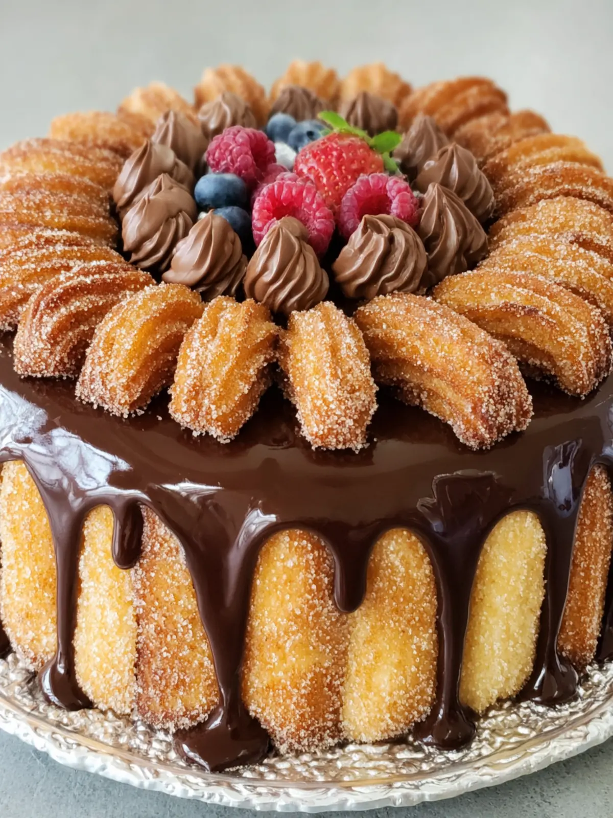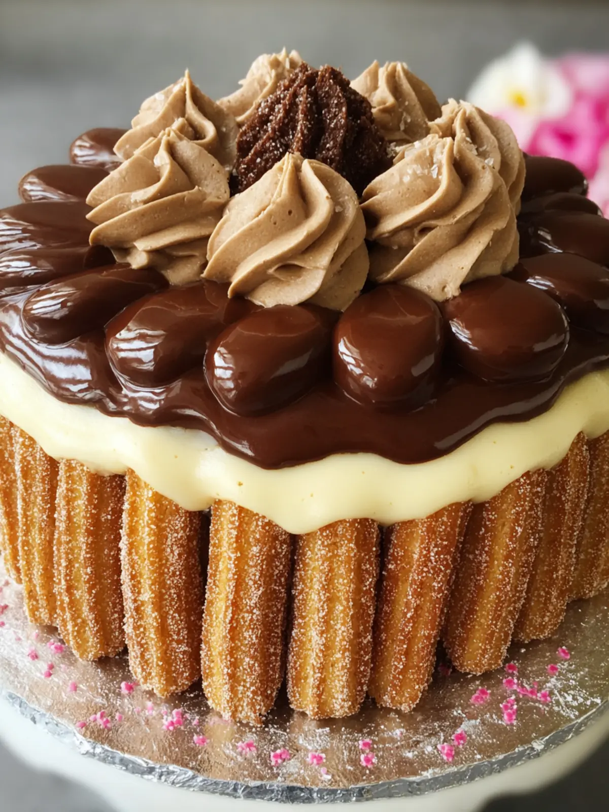 A rich and indulgent cake featuring layers of chocolate cake, churros, and creamy ganache.