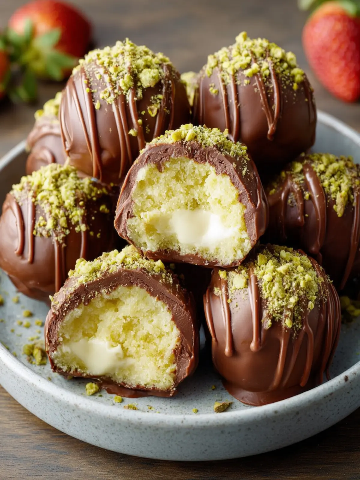 Deliciously crunchy kataifi balls filled with a creamy pistachio mixture and coated in rich chocolate.