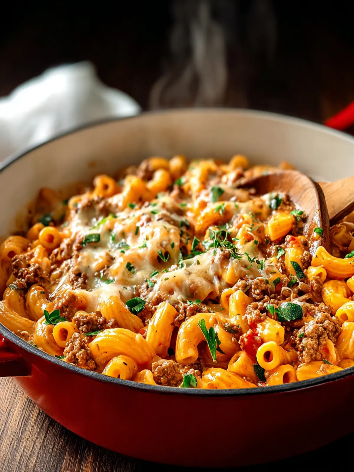 A comforting one-pot cheesy beef pasta dish loaded with vegetables.