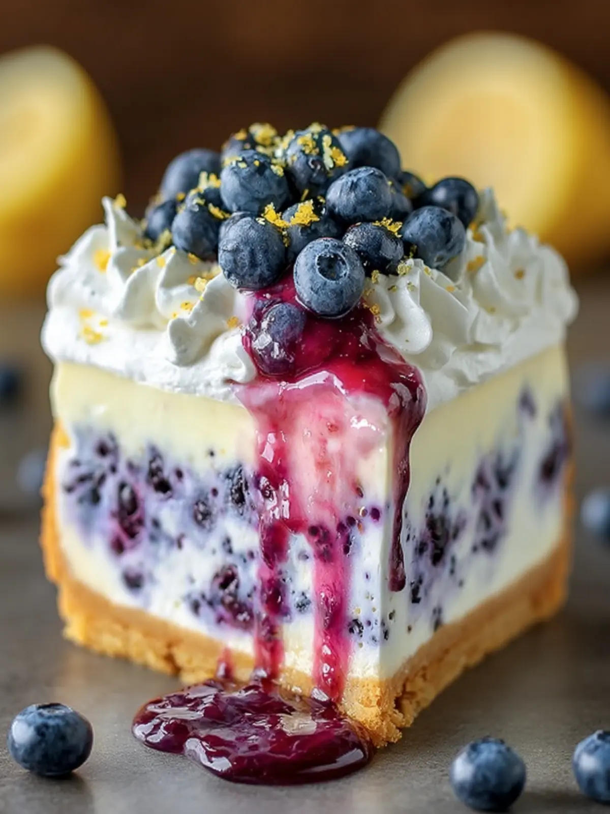 This delightful dessert doesn’t just look stunning; it offers a symphony of textures and tastes that will leave your taste buds dancing. The creamy cheesecake layer strikes the perfect balance between richness and lightness, while the bright notes of lemon offer a refreshing contrast that makes each bite sing. The blueberries not only add a pop of color but also a burst of natural sweetness that complements the other flavors beautifully.