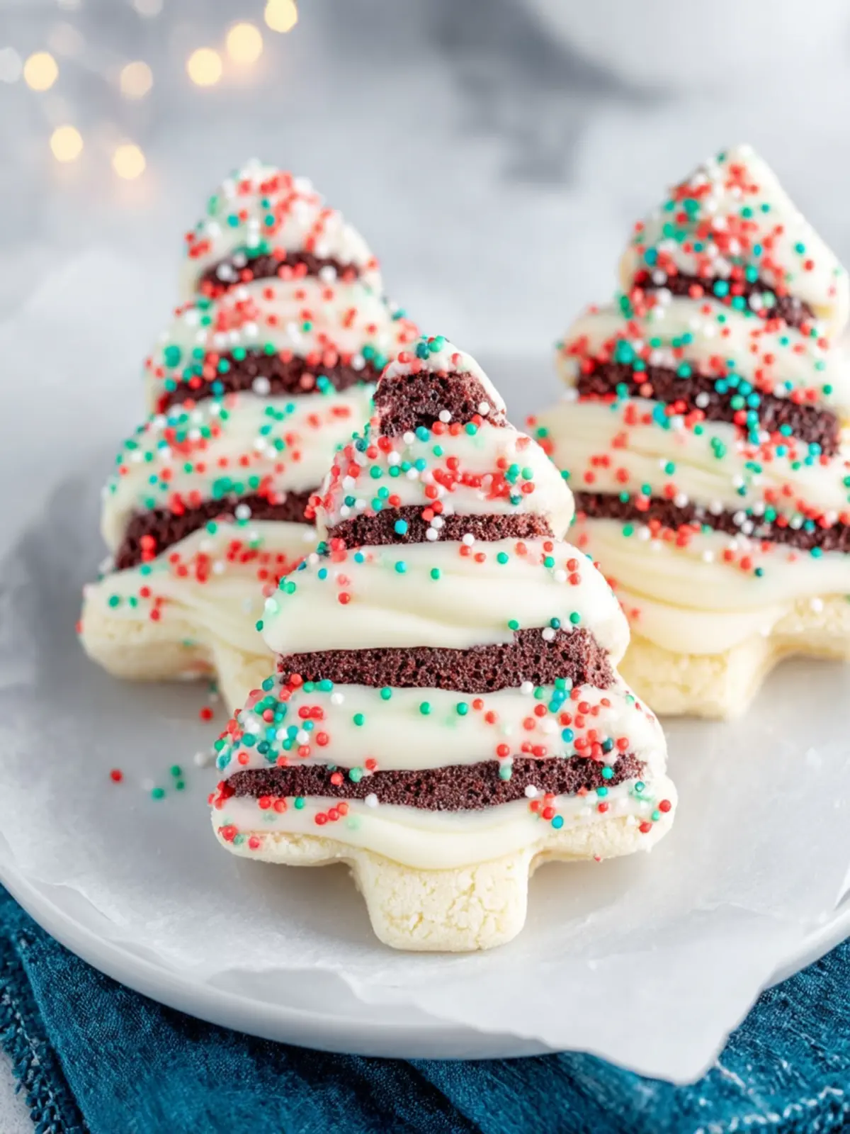 Delicious Christmas tree shaped cake sandwiches coated with chocolate and decorated with sprinkles and icing.