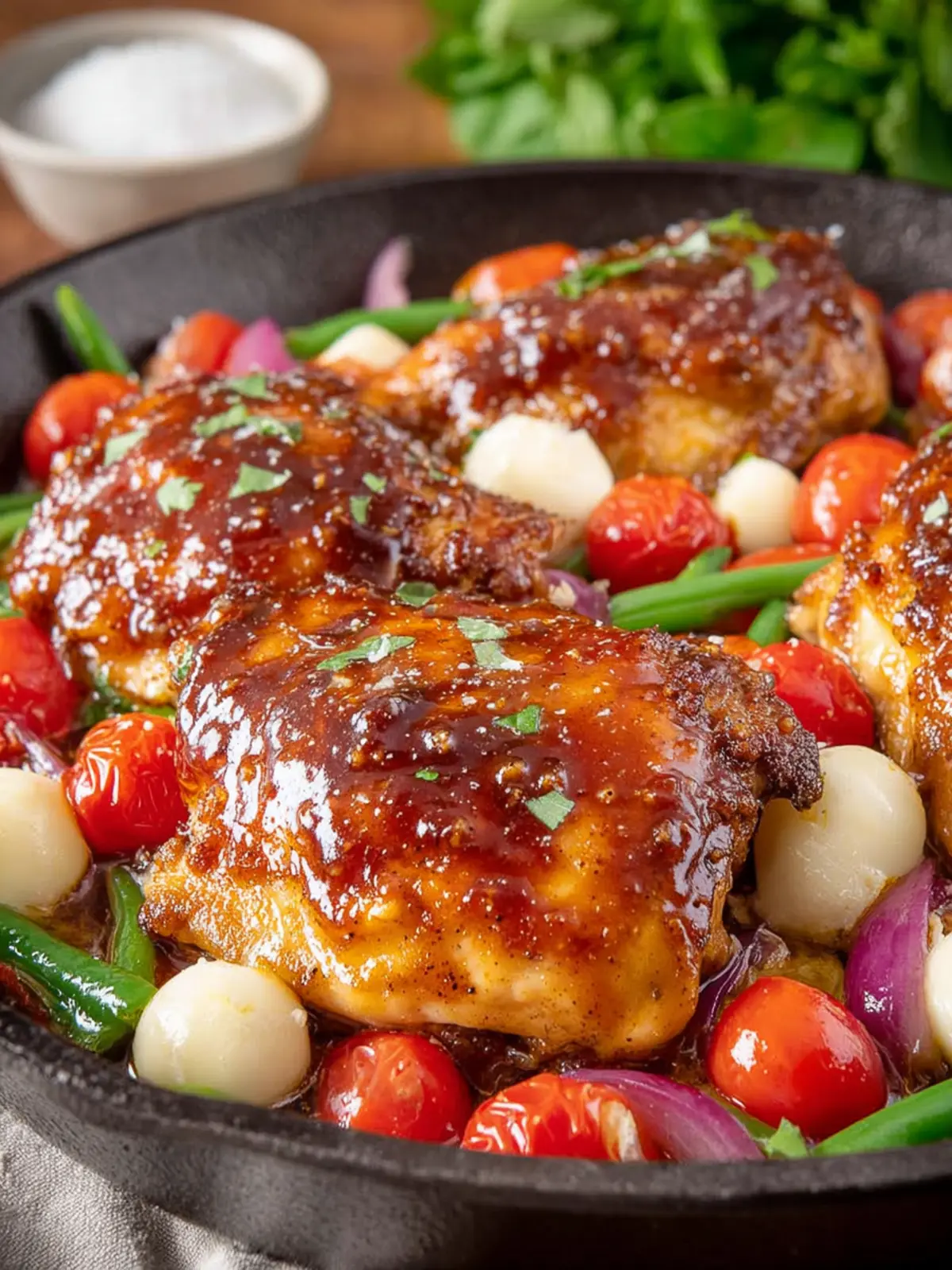 Chicken Thighs: For my one pan balsamic chicken recipe, using bone-in, skin-on chicken thighs enhances the dish’s flavor. The combination of juicy meat and crispy skin creates a delicious contrast that’s hard to resist. If you’d like, you can also use skinless pieces for a lighter option, but you might lose some of that rich flavor.