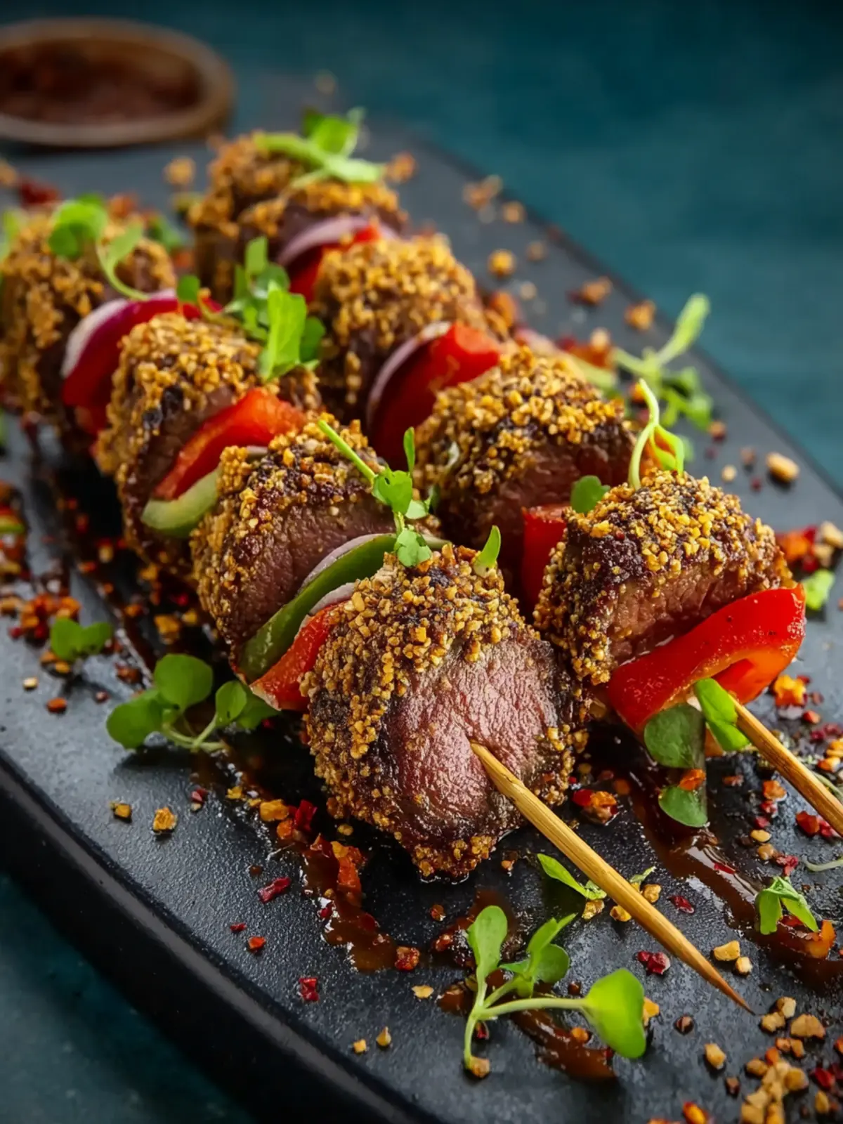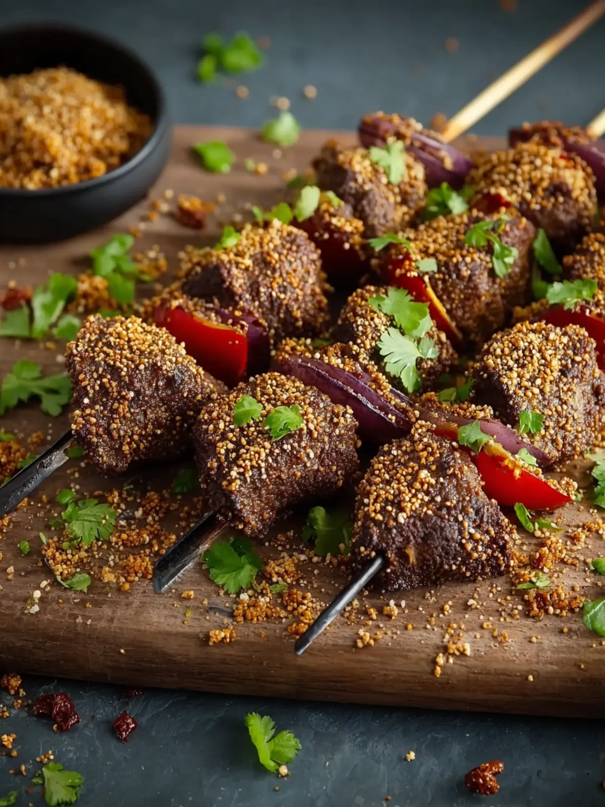 The peanut crusted beef kebabs are a delightful blend of savory beef and a crunchy peanut coating that creates an unforgettable combination of textures. Marinated to perfection, the beef absorbs all the wonderful flavors, while the peanuts add a rich, nuttiness that elevates the dish far beyond your average kebab.