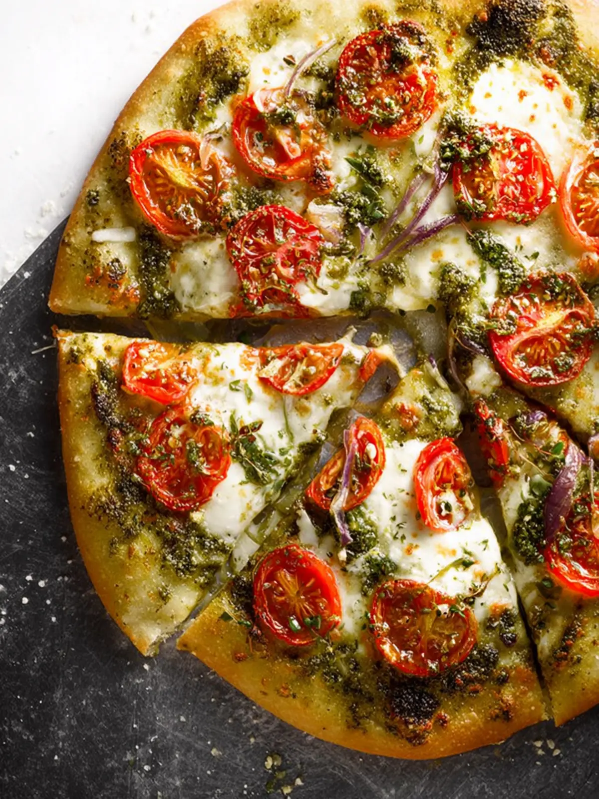 A delicious homemade pizza topped with pesto, mozzarella, and fresh tomatoes.