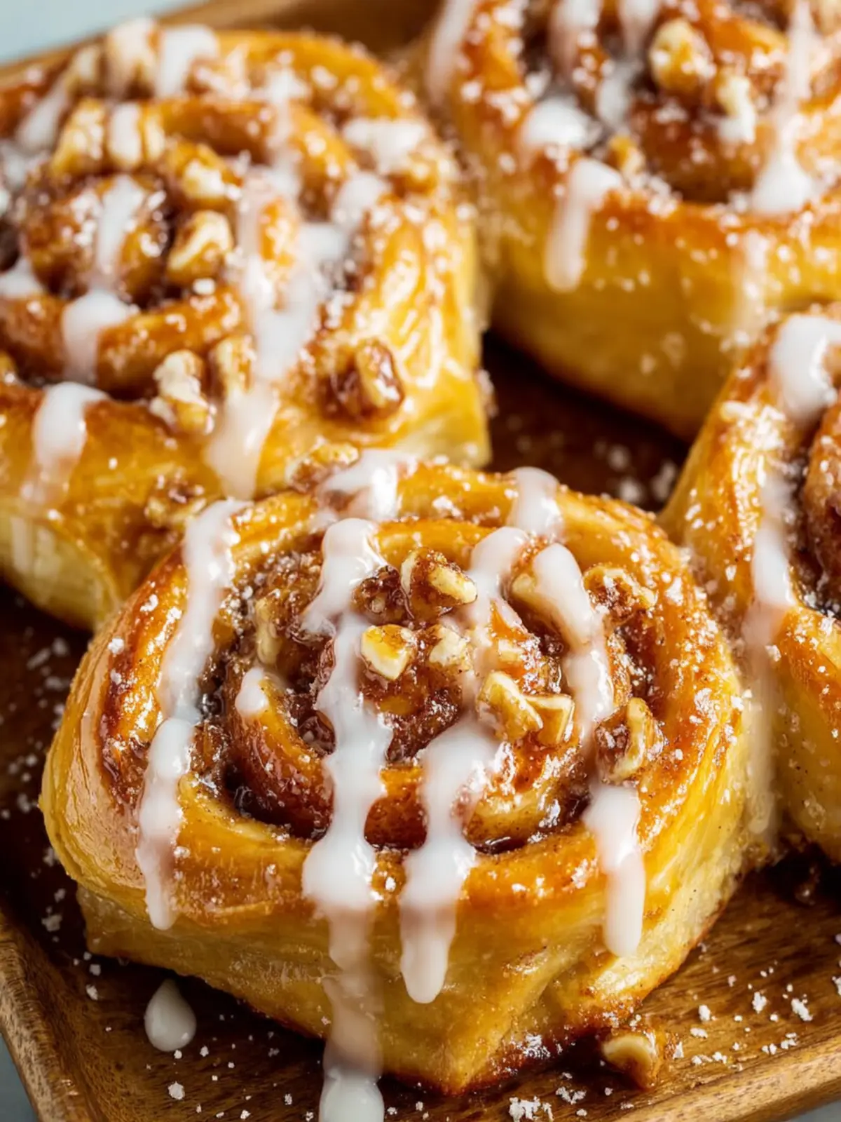 Delicious pecan cinnamon rolls made with flaky puff pastry, toasted pecans, and a sweet glaze.