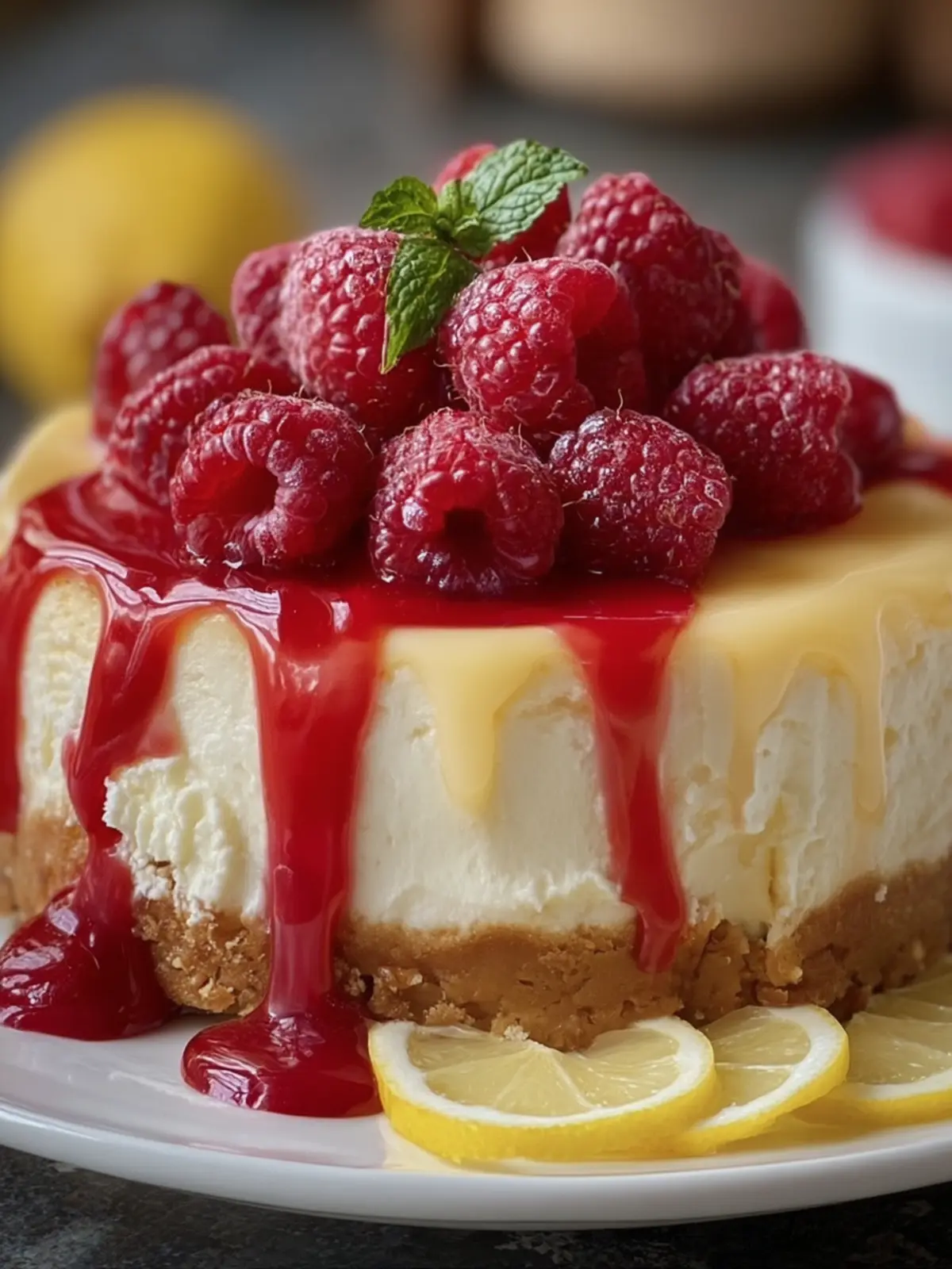 A delicious and refreshing cheesecake infused with raspberry and lemon flavors, perfect for any occasion.