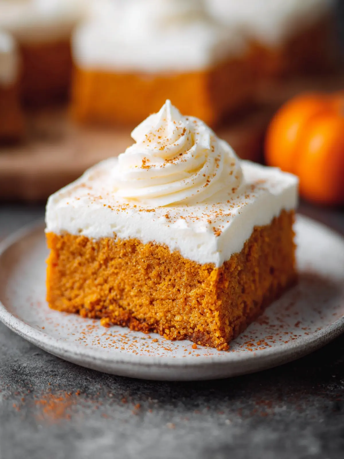 Delicious and moist pumpkin bars topped with creamy frosting, perfect for any occasion.