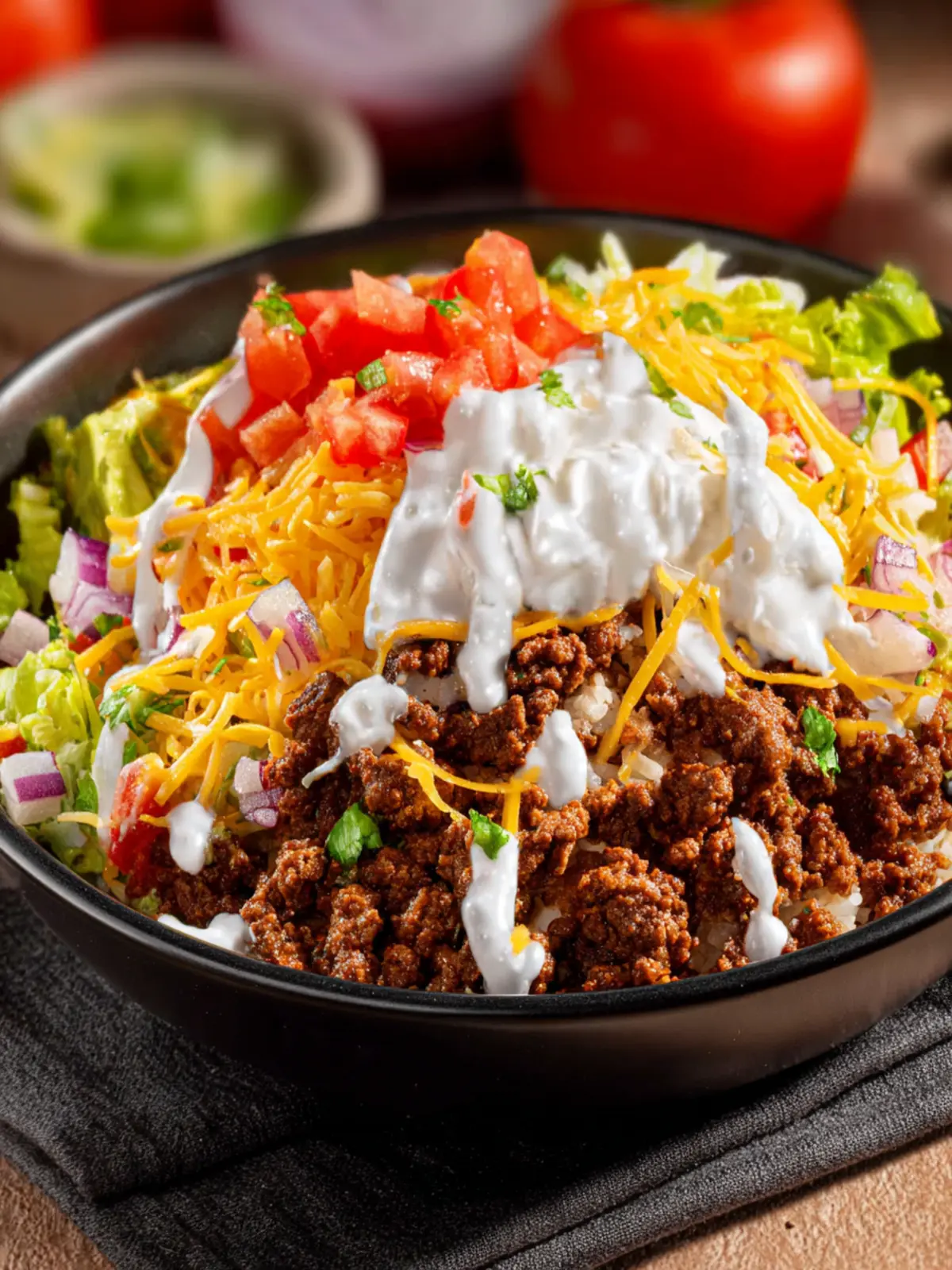 Delicious and easy-to-make taco bowls filled with seasoned beef and fresh ingredients.