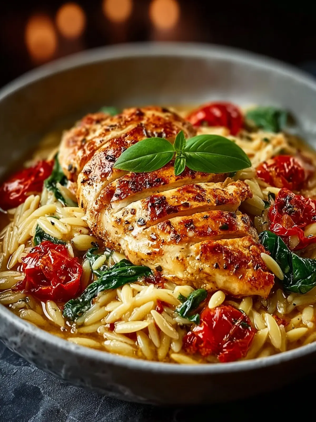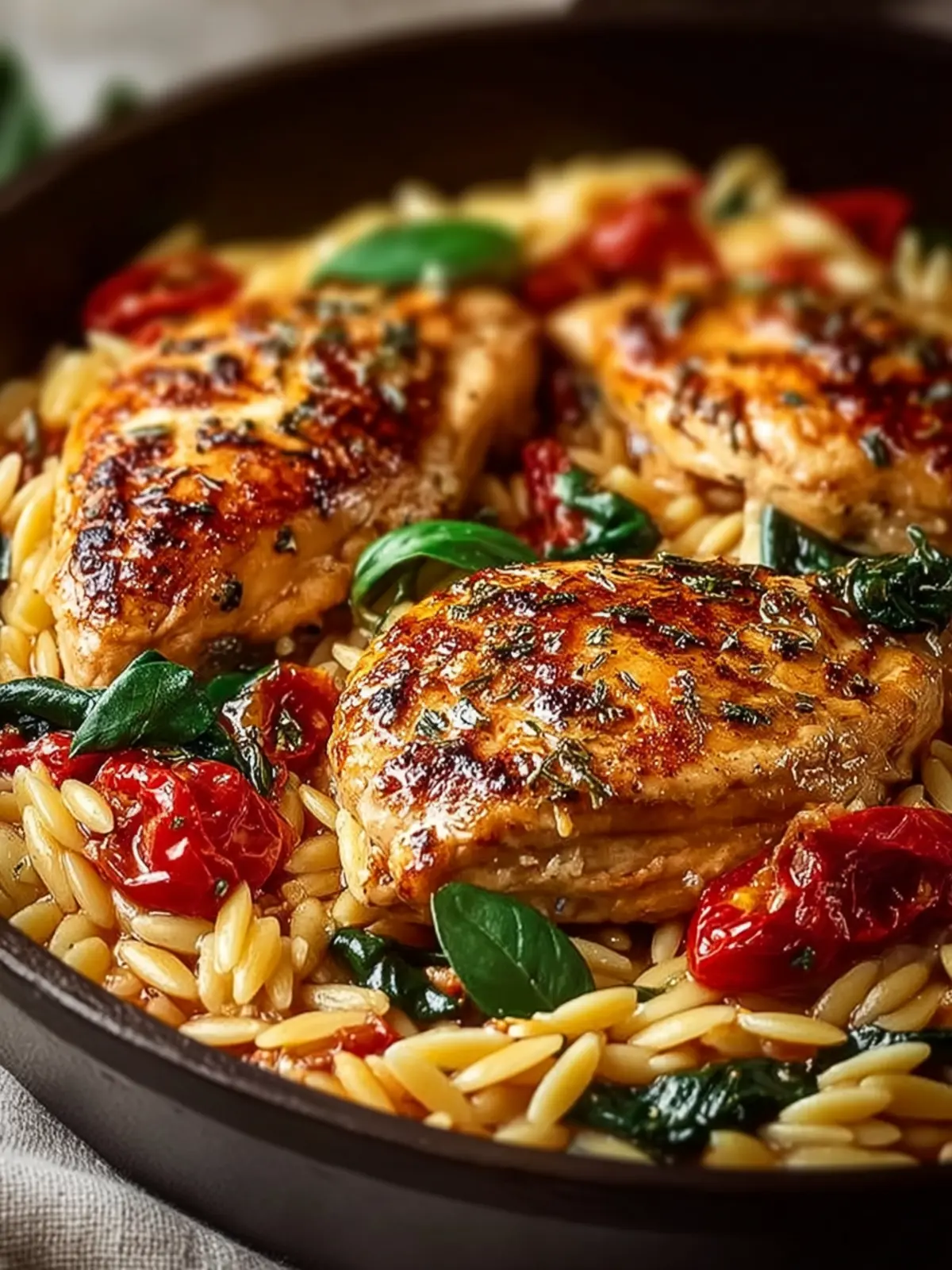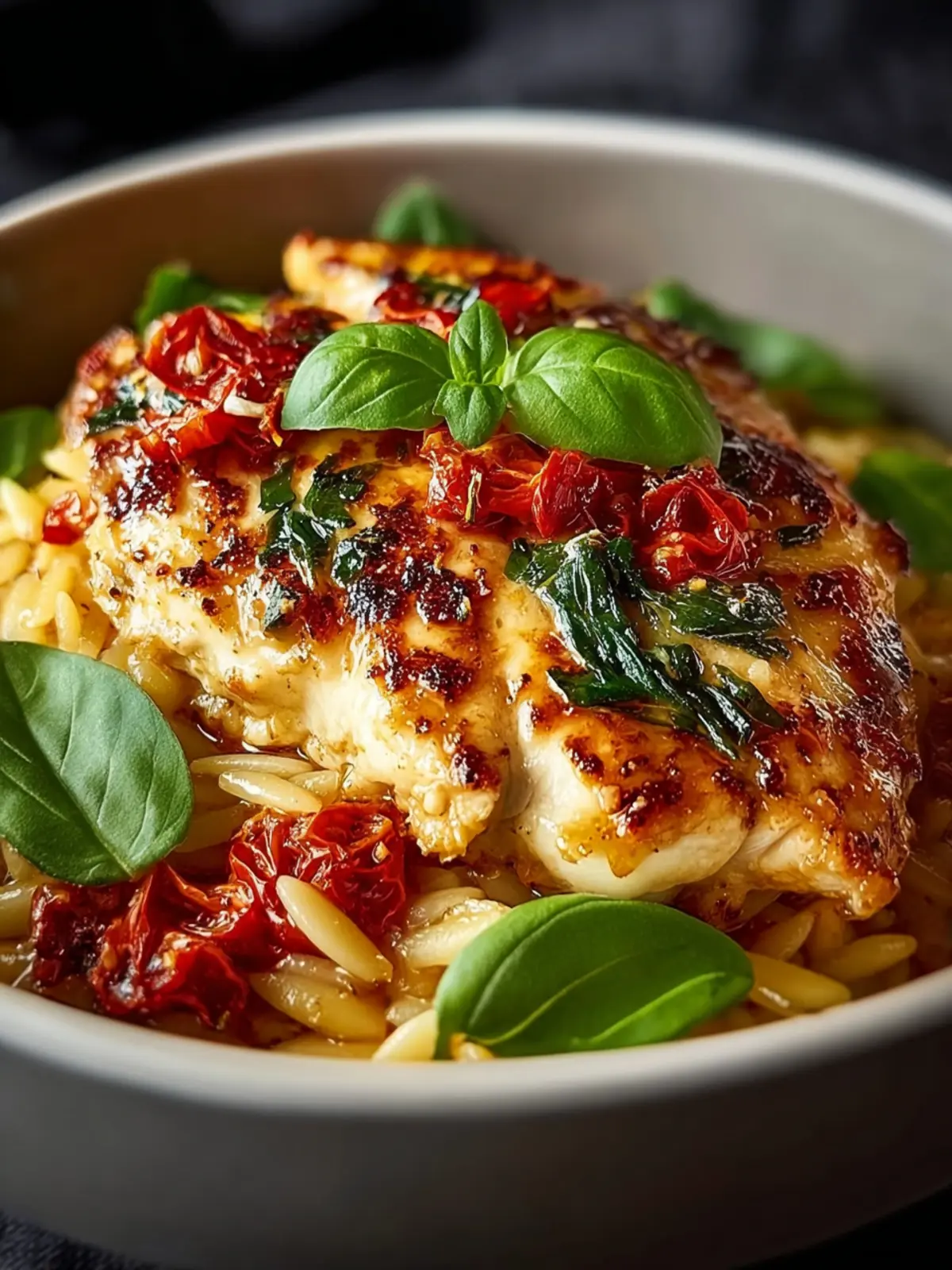 A delicious creamy dish featuring chicken and orzo pasta, flavored with sun-dried tomatoes and fresh spinach.