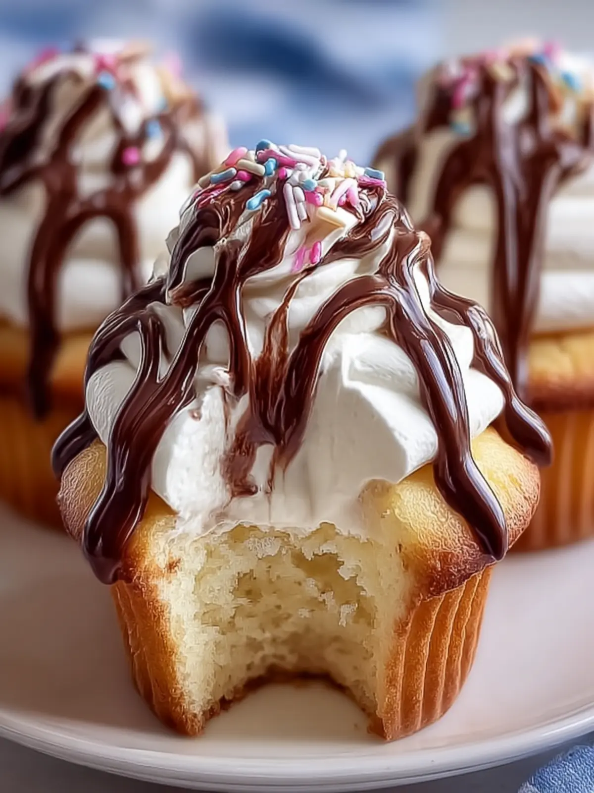 Delicious vanilla cupcakes topped with a rich chocolate drizzle.