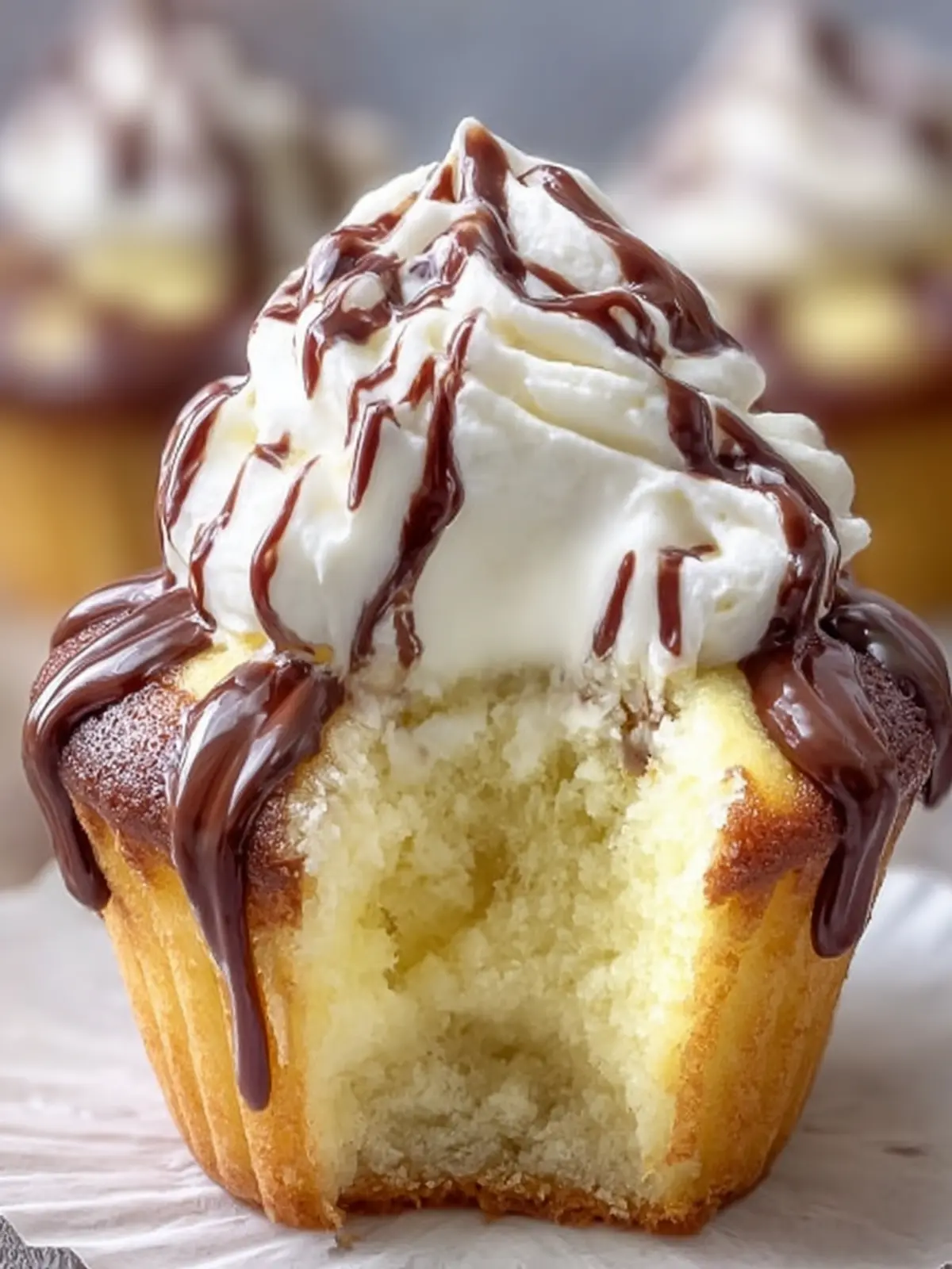 5. Frost the Cupcakes: Once the cupcakes are completely cool, pipe or spread whipped cream on top of each cupcake. Drizzle the chocolate over the whipped cream using a spoon or a piping bag.